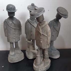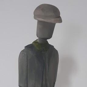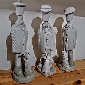 The figures do not represent specific people but their anonymity allows us to identify for ourselves familiar individuals. Built up carefully from the base, each component part is made from thin slabs marked by rolling clay onto textured cloth or clay molds. Once assembled other elements are added giving each piece a unique character.