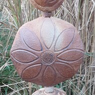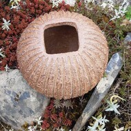 This work of garden vessels, sculptures and totems reflect my interest in texture. I often use natural materials, slate, shale and oxides to colour the raw surface before marking and stretching the clay. This process gives the impression of erosion by the forces of time, sea, weather and man. These vessels are high fired in a wood kiln and are frost proof.
